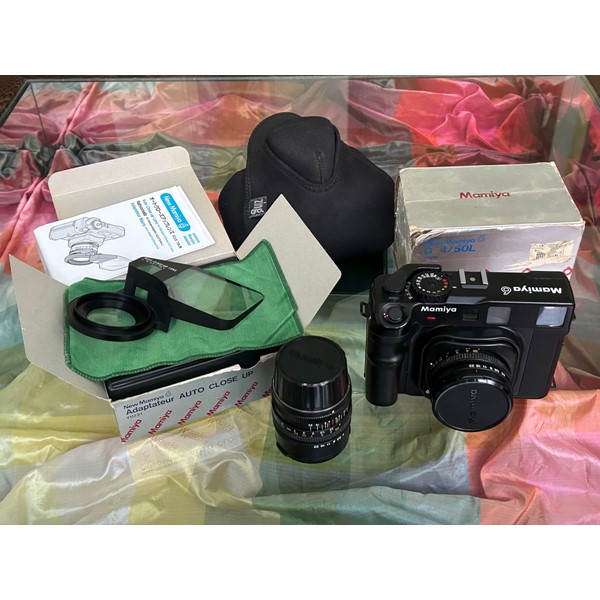 Een Mamiya 6 'range finder' fototoestel, voor 6 X 6 middenformaat film. 75mm en 50mm lenzen en ook en zeldzaam voorzetlens voor close ups. Inclusief en Zing neoprene tas. Een prachtige toestel en lenzen, in zeer goede staat.